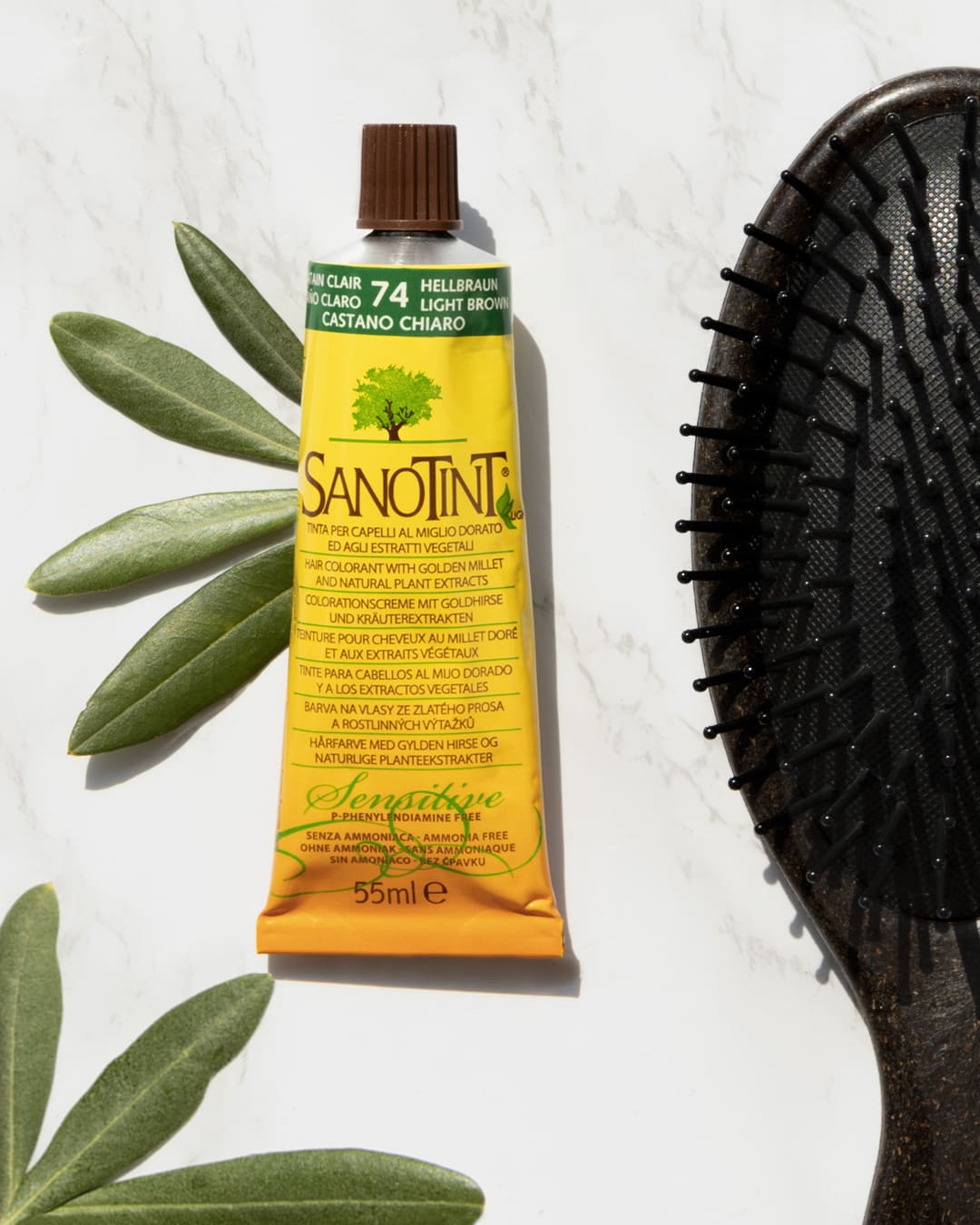 SANOTINT® hair color is composed of 94.5% natural ingredients. It combines plant-based extracts with a minimal amount of synthetic pigments, ensuring a gentler application. The formula excludes harsh chemicals such as ammonia, parabens, paraffin, silicones, formaldehyde, and resorcin, which are commonly found in traditional hair dyes.